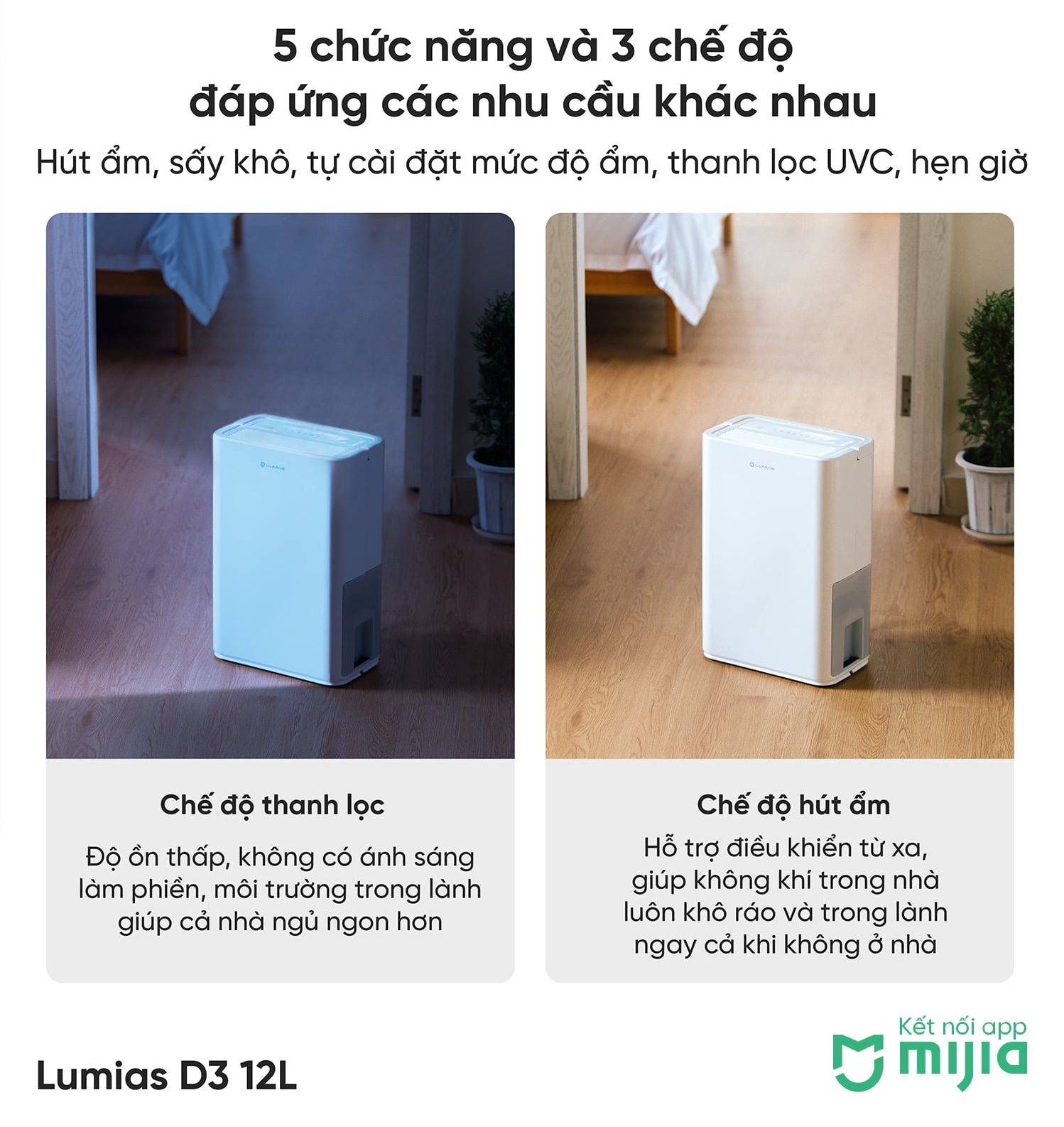 Lumias D3 là một trợ thủ đắc lực, giải pháp toàn diện cho việc chăm sóc chất lượng không gian sống. Hoạt động hiệu quả, cho ta có bầu không khí trong lành một cách nhanh chóng. Với 5 chức năng thông minh bao gồm: