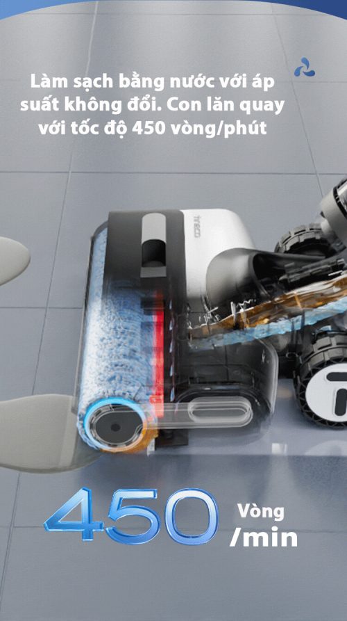 Tineco S3 sau khi hoàn tất quá trình dọn dẹp. Tineco S3 sẽ tự động giặt sạch giẻ để sử dụng cho lần lau dọn kế tiếp. Chổi lăn của máy sẽ được giặt với nước sạch.
