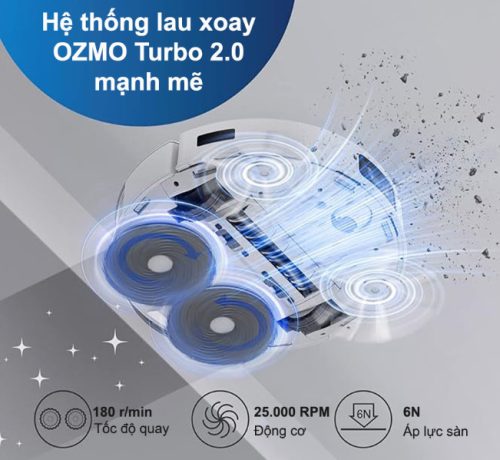 Deebot T20e Omni sở hữu lực hút vô cùng mạnh mẽ lên tới 7100Pa. Tốc độ xoay cây lau nhà 180 vòng/phút – mang đến một hiệu suất làm sạch đáng kinh ngạc. Cùng với đó, Robot cũng được kết hợp với Công nghệ lau nhà OZMO Turbo 2.0 – Tạo áp lực 6N, loại bỏ mọi vết bẩn cứng đầu.