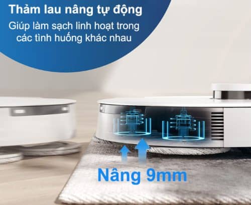 Khi di chuyển đến khu vực chứa thảm, T20e Omni sẽ tự động nâng khăn lau lên 9mm để ngăn ướt thảm, giúp quá trình làm sạch trở nên mạnh mẽ và hiệu quả, linh hoạt trong nhiều tình huống khác nhau