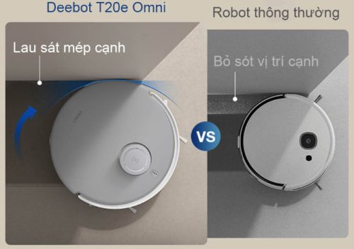 Deebot T20e Omni được thiết kế với Chức năng làm sạch sâu cạnh. Sử dụng phương pháp lắc đuôi để làm sạch dọc theo các bức tường. Robot xoay thân và mở rộng miếng lau sàn để tiếp cận các góc với khoảng cách chỉ 3mm.