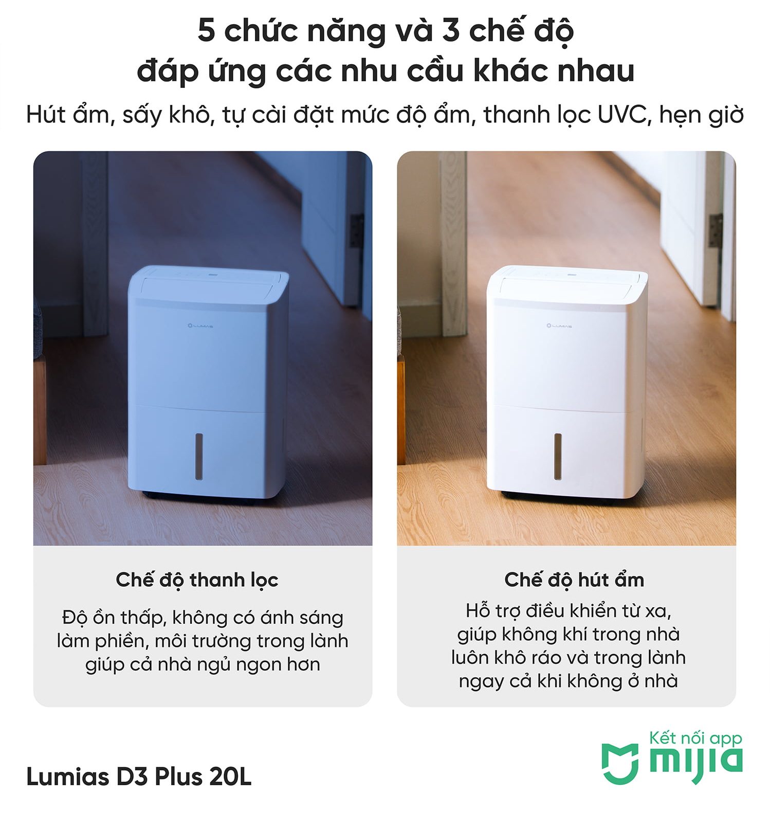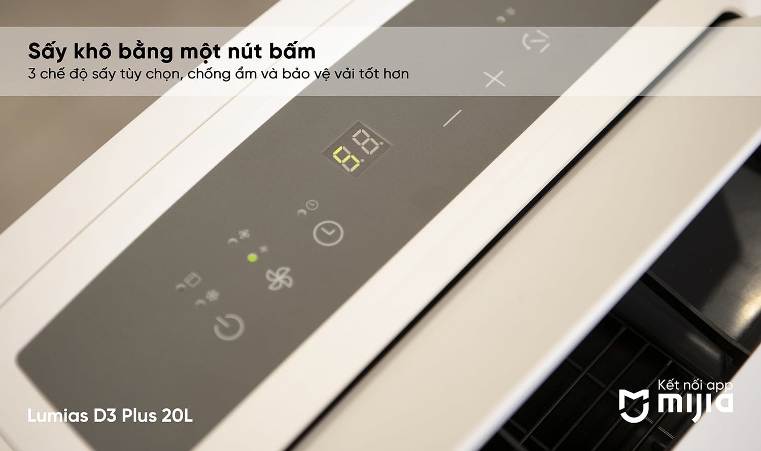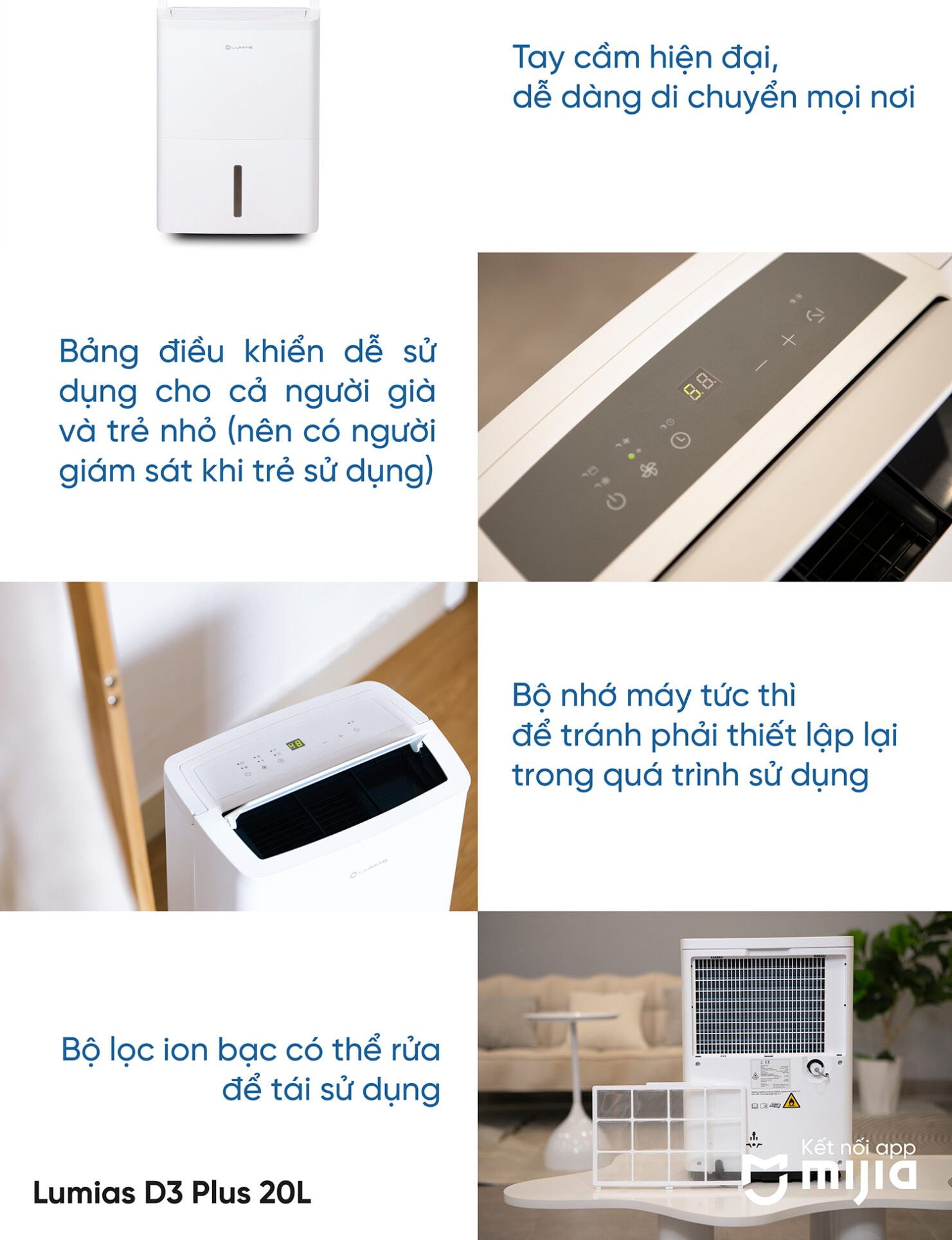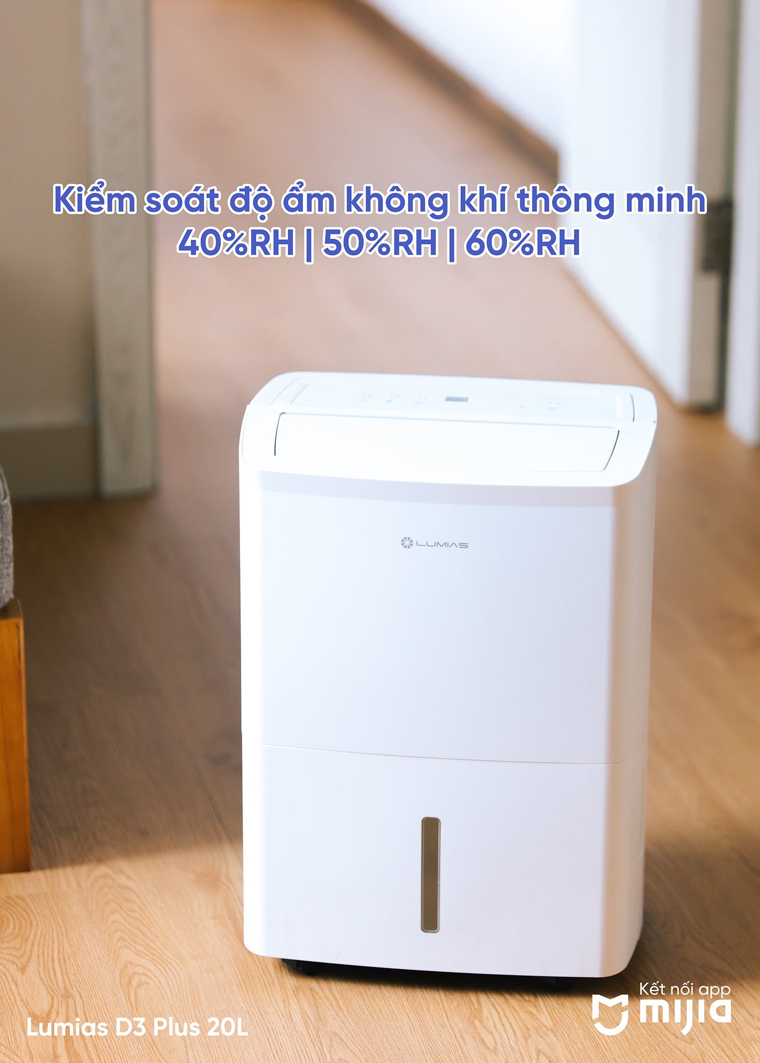 Máy hút ẩm thông minh Lumias D3 Plus với thiết kế hiện đại, màu trắng trẻ trung. Phù hợp cho mọi không gian như phòng khách, phòng ngủ hay phòng làm việc trong gia đình. Với dung tích lớn lên đến 20 lít. Lumias D3 Plus sử dụng công nghệ 3 lõi hiện đại giúp hút ẩm mạnh mẽ. Khử khuẩn hiệu quả, bảo vệ sức khỏe cho gia đình.